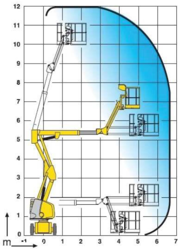 11. 208. W oparciu o przedstawiony wykres pola pracy wskaż maksymalny wysięg platformy roboczej obciążonej masą 80 kg uniesionej na wysokość 18 m: